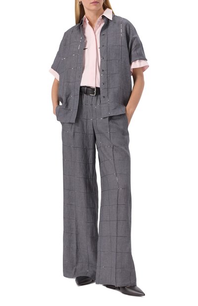 Рубашка из микса льна и шелка составит летний комплект с парными брюками. Модель на обтяжных пуговицах украсили ажурными полосами, которые пересекаются с узкими вставками из кружева в тон.