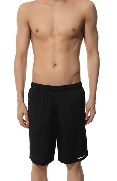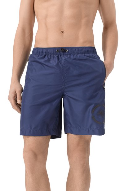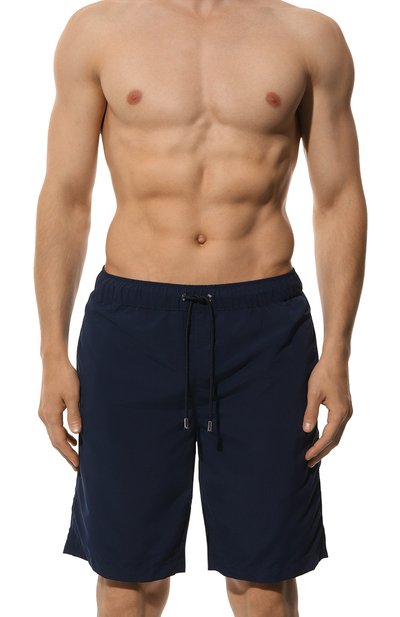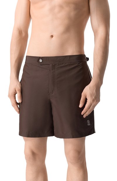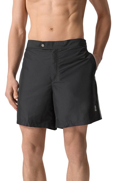 Для пошива плавок-шортов прямого кроя выбрали нейлон с геометрическим микроузором. Оптимальную посадку модели обеспечивает эластичный пояс.