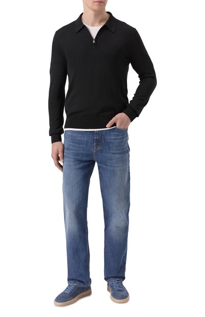 Поло свободного кроя выполнили из шелково-льняного трикотажа. Модель с воротником, манжетами и широким поясом в рубчик гармонично впишется в образ с вещами и в светлой, и в темной гамме.