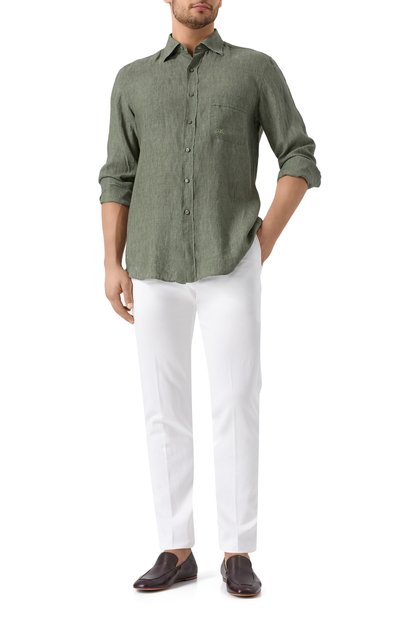 Рубашку с фигурным низом сшили из льняной ткани, изготовленной на фабрике Albini. Меланжевая модель с прямоугольными манжетами застегивается перламутровыми пуговицами от бренда Arienzo.