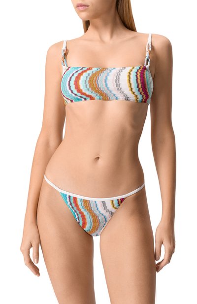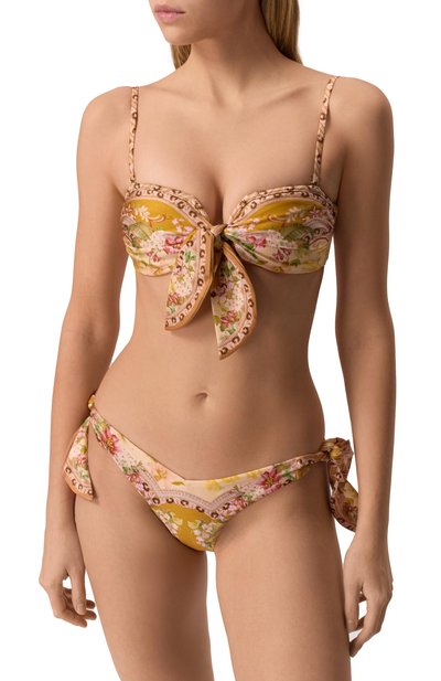 Плавки-бикини с завязками по бокам сшили из эластичного полиэстера с принтом Versace Treasure. Модель с заниженной посадкой дополнили однотонным подкладом.