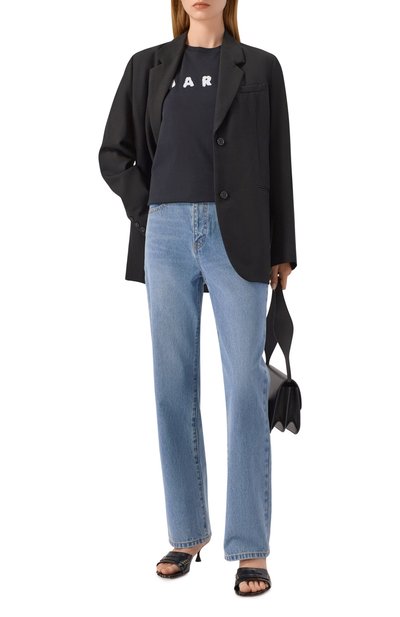 Для пошива футболки прямого кроя использовали хлопковое джерси. Модель с круглым вырезом украсили крупным принтом спереди и надписью готическим шрифтом сзади.