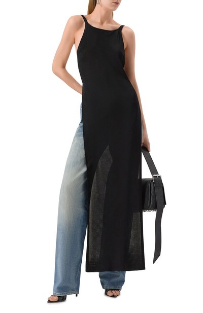 Топ с вырезом халтер, открытой спиной и длинными лентами сшит из струящегося матового шелка. Наши стилисты предлагают создать total black образ с макси-юбкой и мюлями на шпильке.
