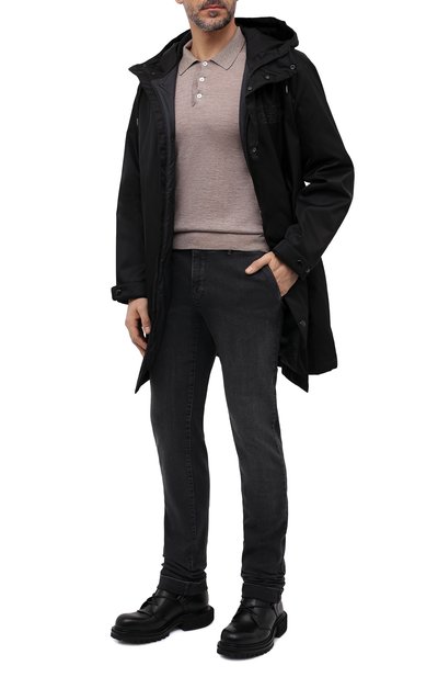 Выбеленные джинсы выполнили из хлопковой ткани с добавлением эластана. Металлическую фирменную монограмму на самом маленьком из пяти карманов повторили в виде вышивки на одном из задних.