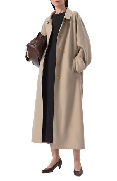 Свободный плащ на клетчатом вискозном подкладе выполнили из хлопковой ткани, покрытой водоотталкивающим воском. Модель с рукавами реглан, двумя боковыми карманами и ремешком на воротнике застегивается потайными кнопками.