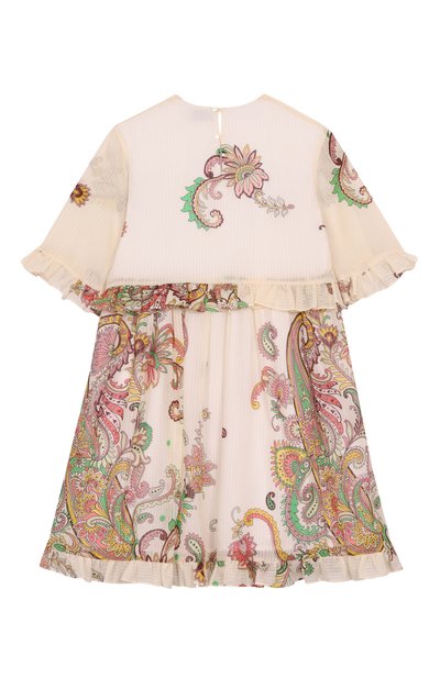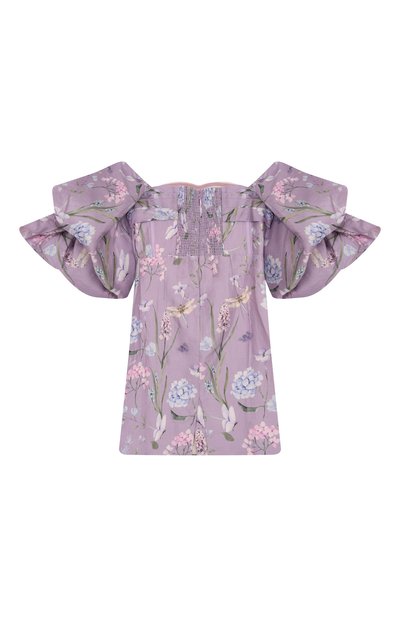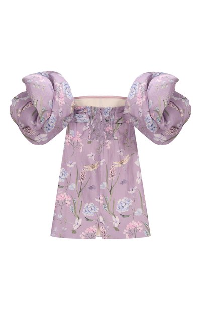 Для пошива платья с растительным брендированным принтом использовали вискозу с добавлением льна и модала. Модель с объемными рукавами-буфами застегивается потайной молнией на спинке с эластичной гофрированной вставкой.