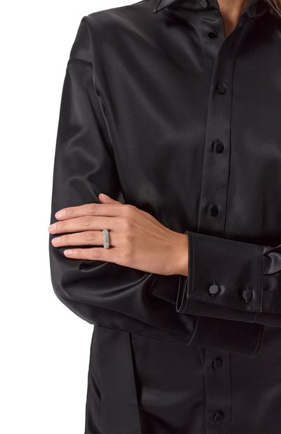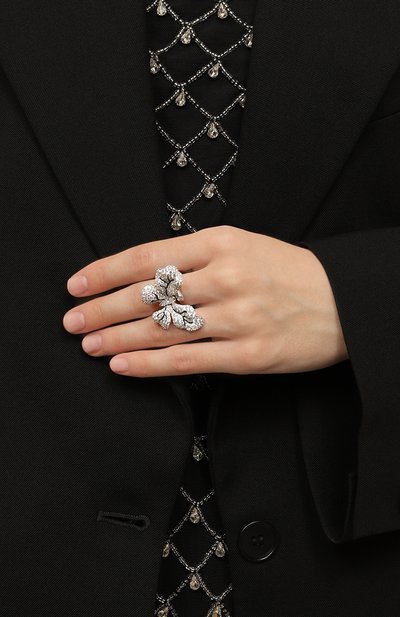 Кольцо изготовили из латуни с гальваническим покрытием палладием. Модель украсили кристаллом и тонкой цепочкой, концы которой оставили ниспадать.