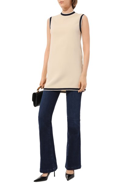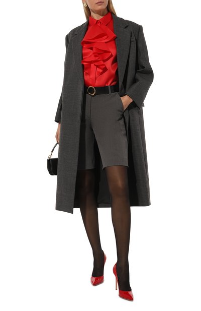 Блузу с боковыми вырезами и закругленными краями выполнили из полупрозрачного шелка. Лаконичную модель дополнили супатной застежкой.
