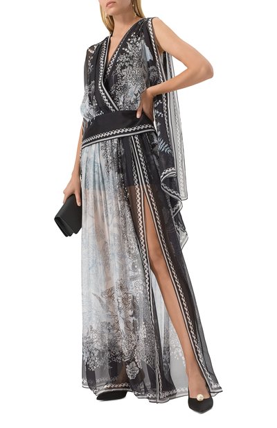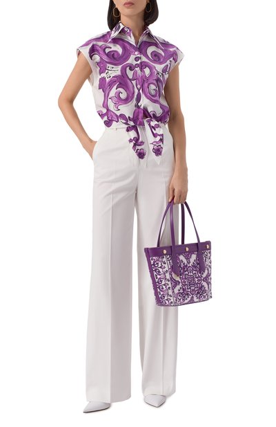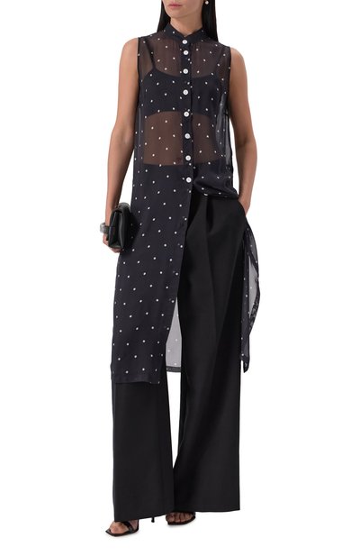 Блузу с боковыми вырезами и закругленными краями выполнили из полупрозрачного шелка. Лаконичную модель допо лнили супатной застежкой.