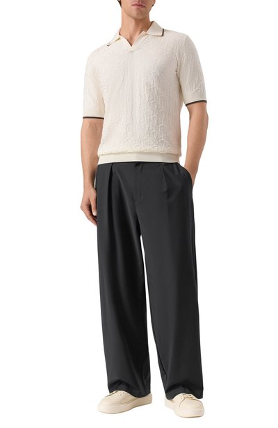 Поло с геометрическим узором спереди связали из микса хлопка и шелка. Модель с рифлеными манжетами, поясом и пуговичной планкой украсили фирменным октагоном с монограммой SR сзади.