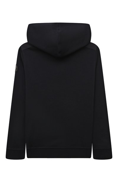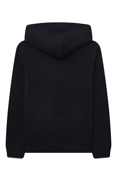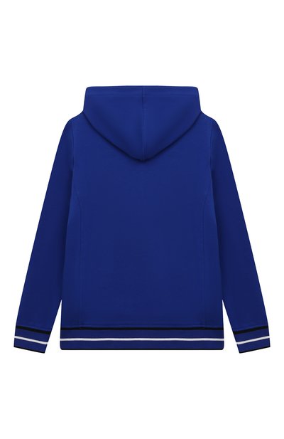 Для изготовления худи использовали эластичный хлопок. Модель с рельефными швами на плечах украсили вышитой эмблемой бренда спереди, а манжеты и пояс подчеркнули полосками.