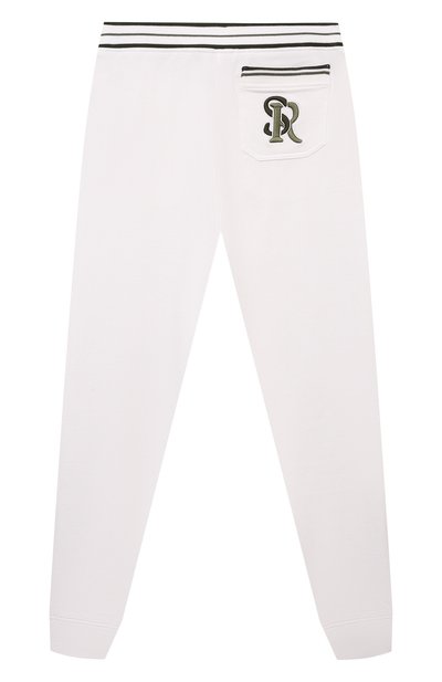 Брюки прямого кроя выполнили из хлопкового трикотажа. Модель декорировали полосатым мотивом на широком эластичном поясе, боковых карманах и накладном заднем с вышитой монограммой SR.