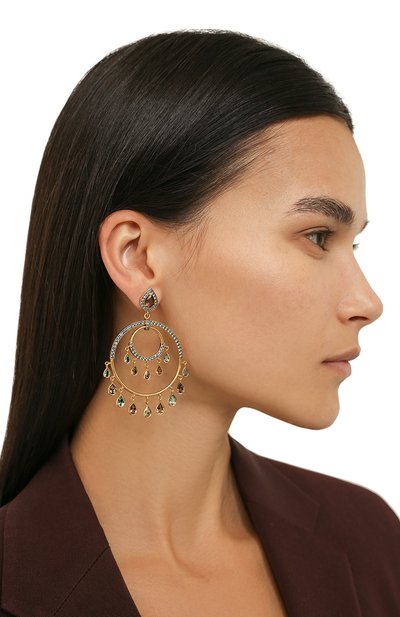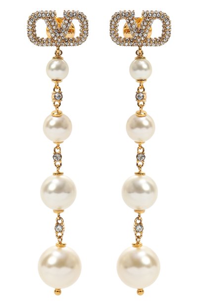 Серьги с застежками-пусетами станут сияющим штрихом в образе. Основание в форме эмблемы VLogo изготовили из золотистого металла и инкрустировали миниатюрными стразами Swarovski. Длинные подвески дополнили кристальными жемчужинами.