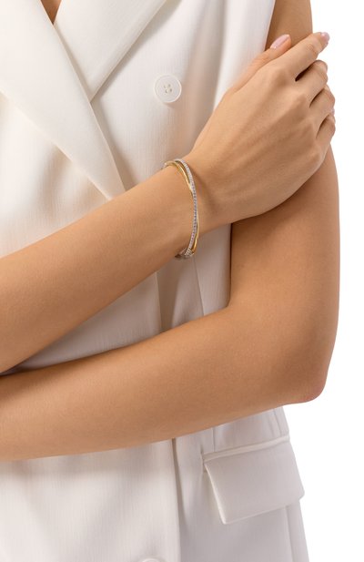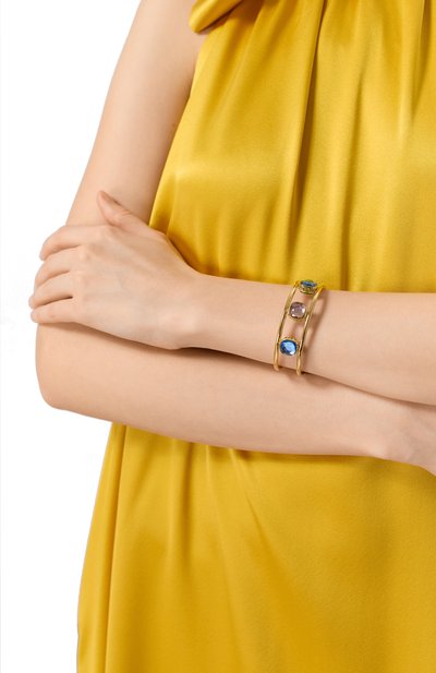 Незамкнутый браслет Chroma Twist выполнили из металла с золотистым покрытием. В центре аксессуара – три поворотные вставки с цветными кристаллами ReCreated™, изготовленными из отходов производства.