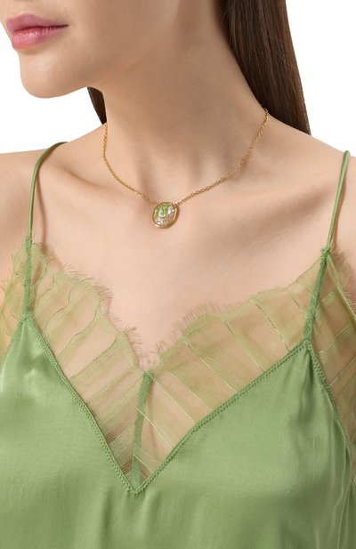 Подвеску из коллекции Idyllia выполнили в виде цветка с лепестками и сердцевиной из кристаллов разных огранок. Украшение закрепили на регулируемой латунной цепочке с ионным покрытием нитридом титана, декорировав ее конец еще одним стразом.