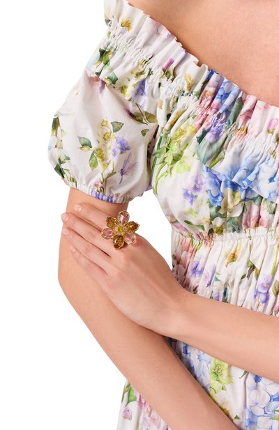 Массивное кольцо Idyllia, словно собранное из трех цветков, выполнили из латуни с ионным покрытием нитридом титана. Украшение декорировали кристаллами каплевидной и круглой огранки.