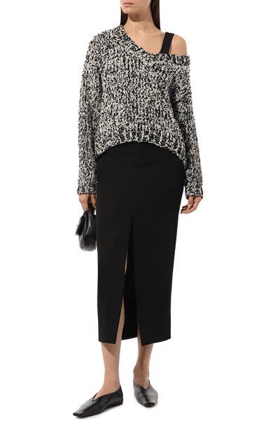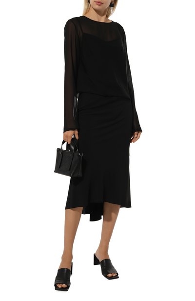 Для изготовления юбки с широким поясом использовали полупрозрачное вискозное джерси. Спереди и сзади модель украсили флокированными брендированными надписями в тон.