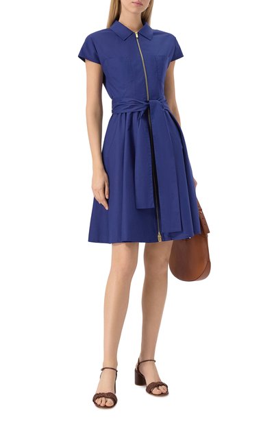 Платье-рубашку Sandy с застежкой на лифе спереди выполнили из тонкой хлопковой ткани с полутонами. Модель с расклешенным подолом дополнили ремнем с пряжкой и пуговицами, позволяющими сформировать и зафиксировать отвороты на рукавах.