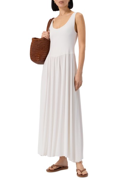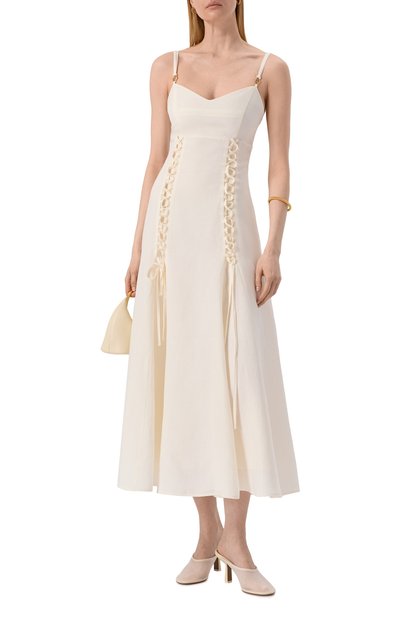 Платье Waterlily без рукавов, с завышенной талией выполнили из тонкой хлопковой ткани стрейч с добавлением полиамида. Модель с V-образными вырезами спереди и на спинке декорировали широкой оборкой на подоле.