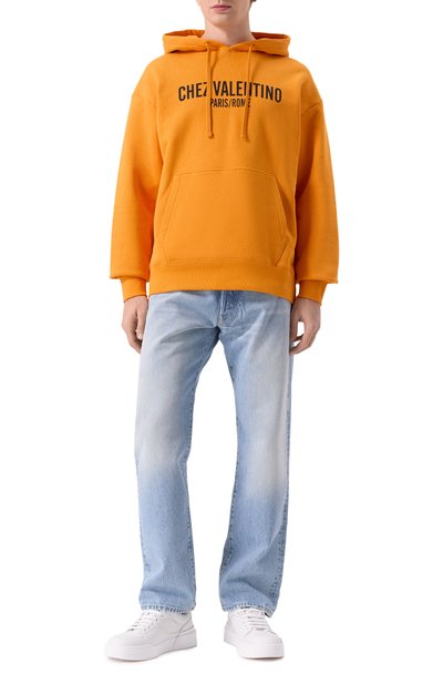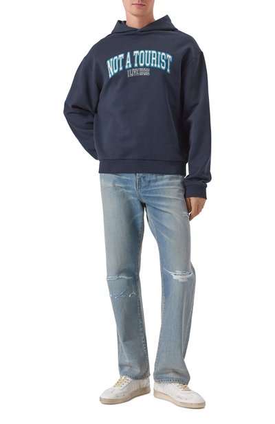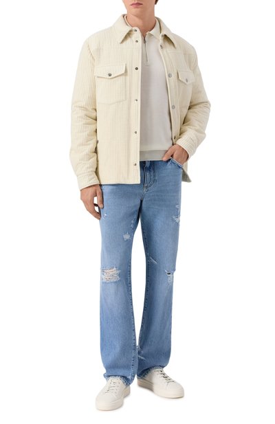 Выбеленные джинсы с фирменной нашивкой сзади декорировали потертостями и разрезом в области колена. Брюки с пятью карманами сшили из эластичного денима на основе органического хлопка.