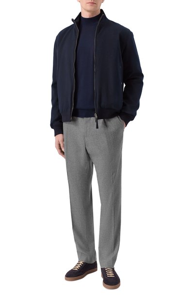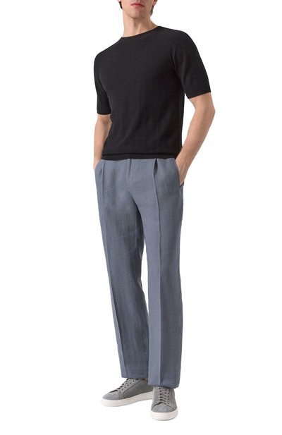 Зауженные брюки с боковыми и задними карманами выполнили из льняного габардина. Модель с двойными защипами спереди застегивается потайными крючками и молнией, а посадку изделия на талии регулирует шнур, продетый в кулиску эластичного пояса.