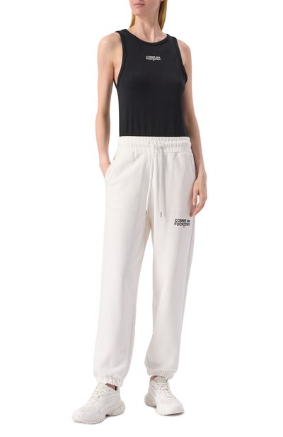 Для изготовления облегающей майки с круглым вырезом использовали эластичный рифленый трикотаж из лиоцелла. Модель украсили спереди контрастным логотипом марки.