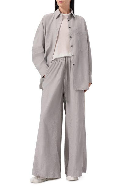 Для пошива рубашки с мелкими складками вдоль кокетки на спинке использовали полупрозрачную ткань из волокон китайской крапивы рами. Модель с фигурным низом и широкими манжетами на двух пуговицах дополнили накладным нагрудным карманом.