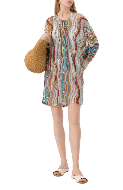 Тунику длиной ниже колена выполнили из полупрозрачной рами. Модель с закругленной линией низа дополнили двумя нагрудными и парой боковых карманов.