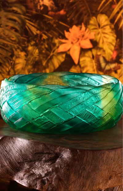 В коллекцию Fleur de Paon Exotique включили хрустальное блюдо для фруктов, созданное в технике литья по выплавляемым моделям. Запатентованное «тесто из стекла» позволило мастерам марки, основанной Жаном Домом, получить естественные переходы цвета. Полупрозрачные листья с прожилками и акцентным кабошоном выглядят как живые и словно светятся изнутри.