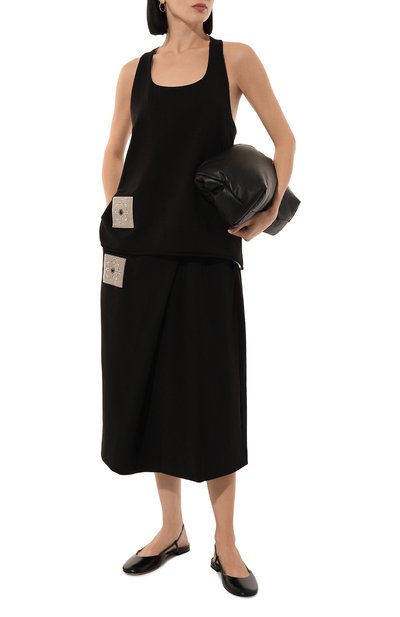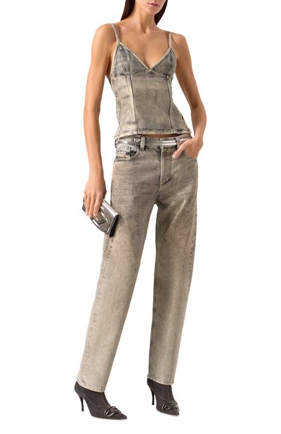Топ Doffiano с мелкими драпировками выполнили из эластичного полиэстера с принтом под змею. Модель со встроенным корсетом и потайной молнией сбоку декорировали серебристой эмблемой на одной из регулируемых бретелей.