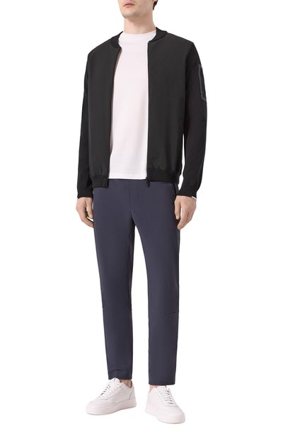 Кардиган Skarley с контрастными полосками на рукавах реглан выполнили из эластичного полиэстерового трикотажа с геометрическим узором. Модель с воротником-стойкой, манжетами и поясом в рубчик дополнили боковыми карманами с молниями.