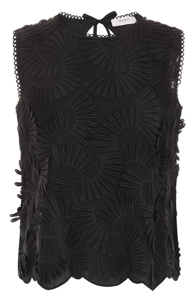 Топ с каплевидным вырезом сзади выполнен из хлопкового муслина. Круглая горловина и проймы отделаны фестончатой каймой, а сама модель свободного кроя украшена объемными вышитыми цветами.