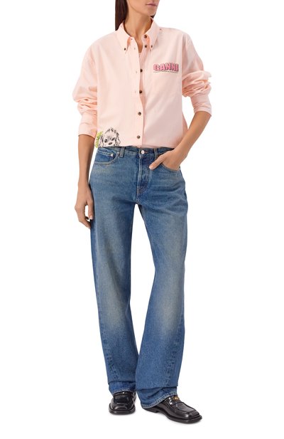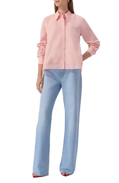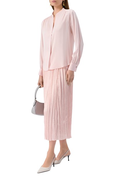 На блузе из полиэстера прозрачные полосы чередуются с более плотными, переходящими в бахрому. Модель дополнили вставкой из крепа в тон спереди, изготовив из такой же ткани манжеты, воротник и планку с обтяжными пуговицами.