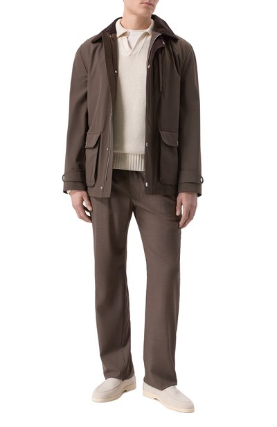 Поло с V-образной горловиной и рельефной отделкой на манжетах и поясе изготовили из шелка с добавлением льна. Модель со спущенной линией плеч будет гармонично сочетаться и с классическими брюками, и с джинсами.