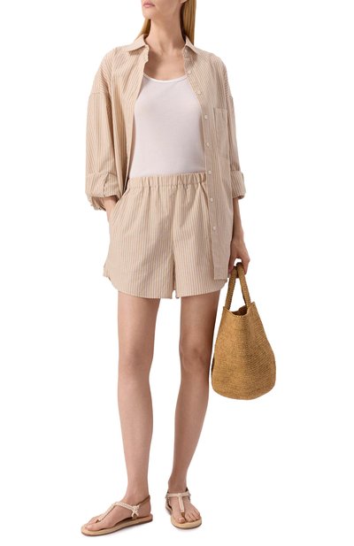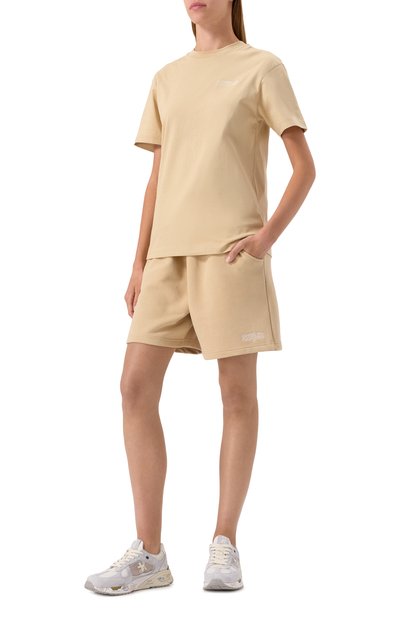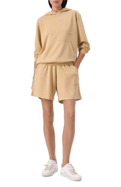Будто выгоревшие со временем шорты с необработанными краями выполнили из хлопкового футера с добавлением полиэстера. Модель с широким поясом-кулиской и двумя боковыми карманами украсили потертостями, разрывами и логотипом марки.