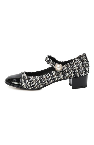 Туфли с небольшим каблуком сшиты из твида. Стелька и вставка на круглом мысе выполнены из гладкой кожи. Модель фиксируется на ноге узким ремешком с кристальной кнопкой.