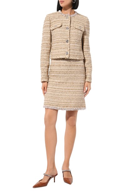 Мюли с удлиненным квадратным мысом выполнили из кожи с принтом и тиснением под питона. Модель поставили на высокую фигурную танкетку, отделанную материалом в тон.