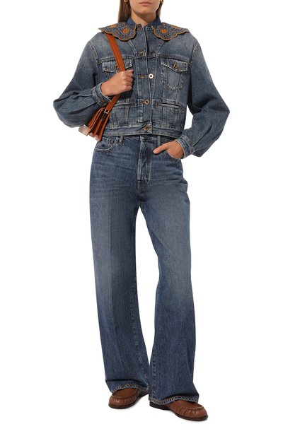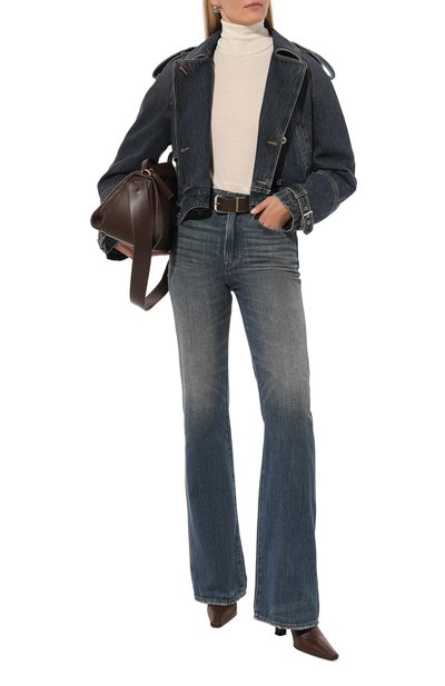 Укороченную куртку с запахом на завязках выполнили из денима. Модель с регулируемыми ремешками на поясе и накладными нагрудными карманами с клапанами декорировали сзади кожаным патчем с логотипом.