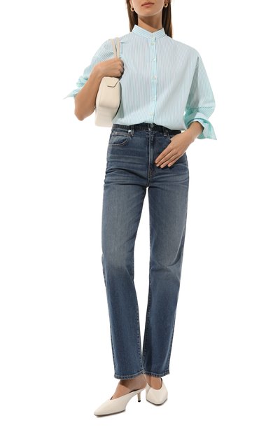 Рубашку с бантовой складкой сзади и приспущенной линией плеч выполнили из хлопка в тонкую полоску. На нагрудном кармане модели разместили эмблему марки, вышитую в тон.