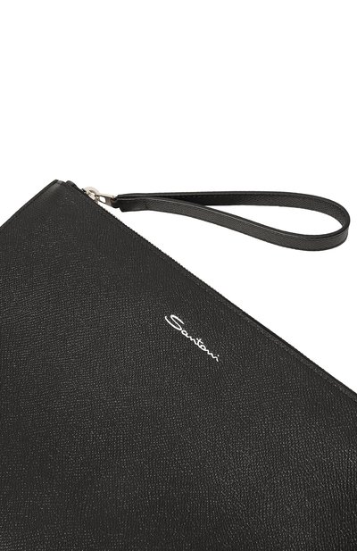 Папку для документов формата А4, декорированную фольгированным логотипом спереди, выполнили из зернистой кожи. Внутри модель с плоской ручкой сзади и молнией с длинным пуллером дополнили накладным карманом и слотом для карт.