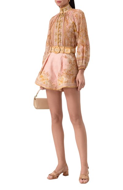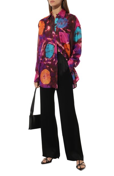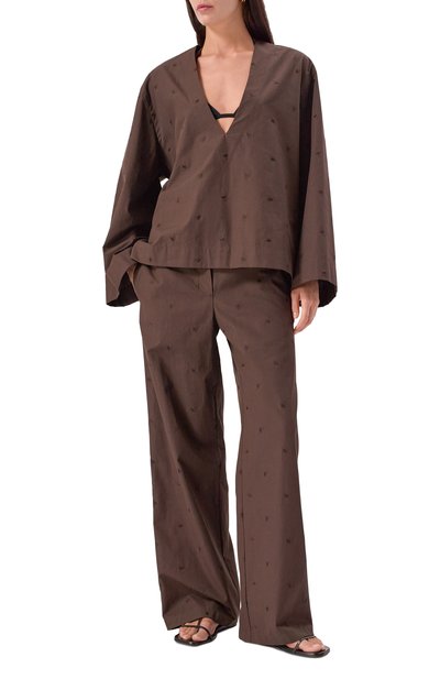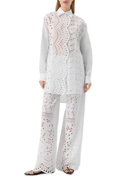 Удлиненную рубашку выполнили из хлопкового поплина с вышивкой сангалло. Модель с закругленным подолом и фестончатой пуговичной планкой составит гармоничный дуэт с парными брюками и мюлями в тон.