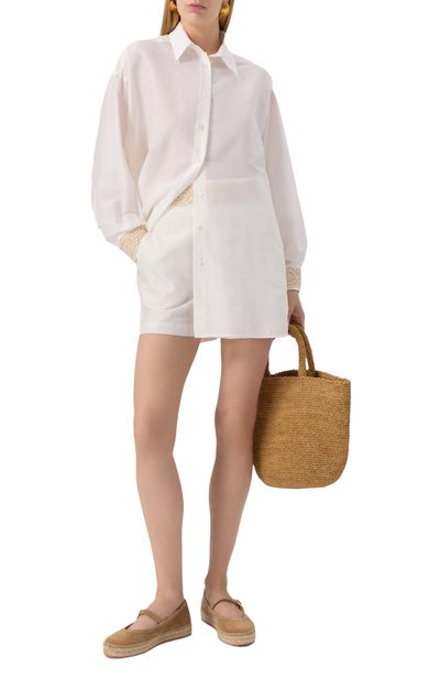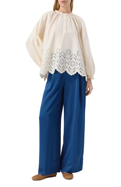 Ажурную блузку с отложным воротником и закругленным подолом сшили из хлопкового гипюра. Модель свободного кроя застегивается потайными пуговицами. Наши стилисты предлагают создать обра з с мини-юбкой и туфлями в тон.