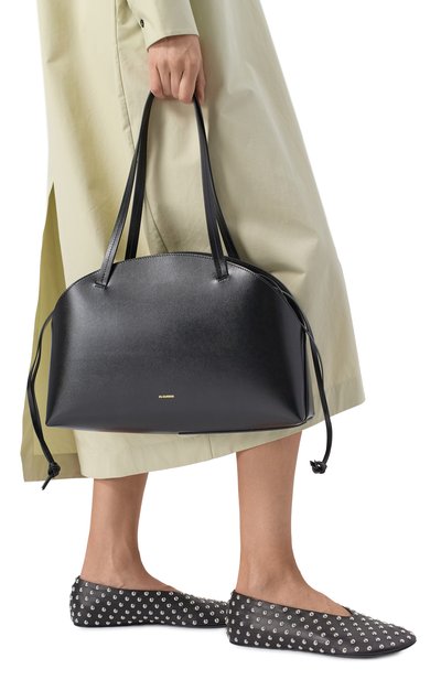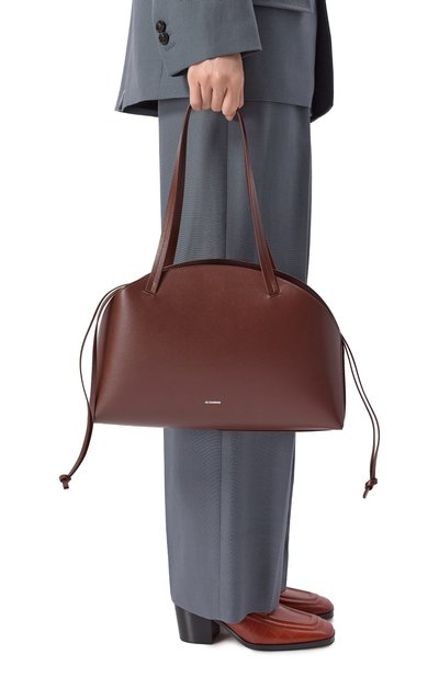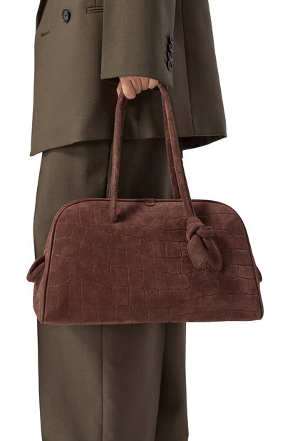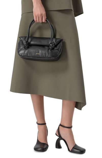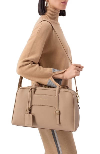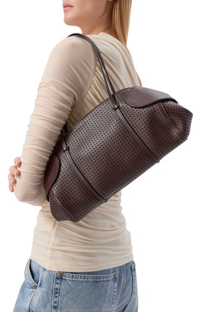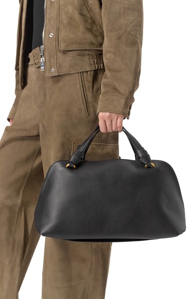 Сумку Aries со съемным ремнем, закрепленными узлами ручками и перемычкой для руки на дне сшили из телячьей кожи. Модель на встречной молнии, скрывающейся под лентами, украсили спереди тисненым логотипом.