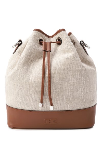 Сумку с фирменной литерой K спереди выполнили из холщовой ткани, а для отделки выбрали кожу. Модель со съемной ручкой затягивается шнурком, украшенным брендированными металлическими эглетами.