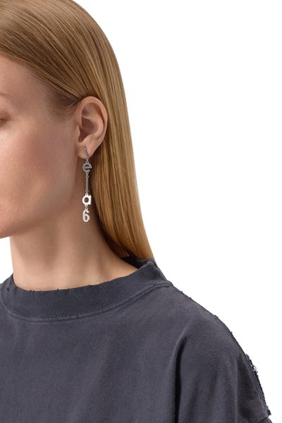 Серьги с застежкой-пусетой изготовили из латуни с гальваническим покрытием палладием. Одну из подвесок выполнили в форме цепочки с застежкой-карабином, а вторую – в виде пластины с фирменным числовым кодом.