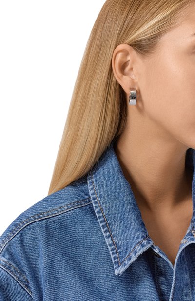 Серьги с застежкой-пусетой изготовили из латуни с гальваническим покрытием палладием. Одну из подвесок выполнили в форме цепочки с застежкой-карабином, а вторую – в виде пластины с фирменным числовым кодом.