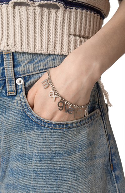 Узкий незамкнутый браслет выполнили из полированного серебра 925-й пробы. На внешней стороне аксессуар декорировали выг равированным числовым кодом.