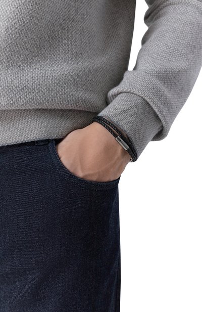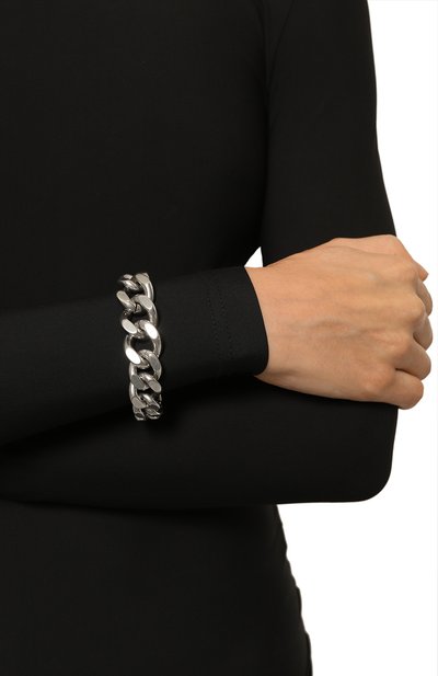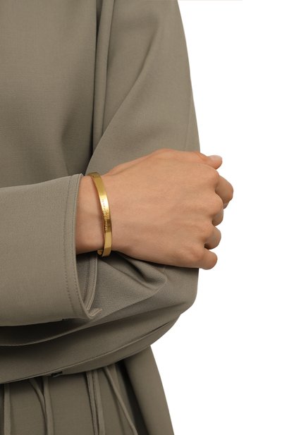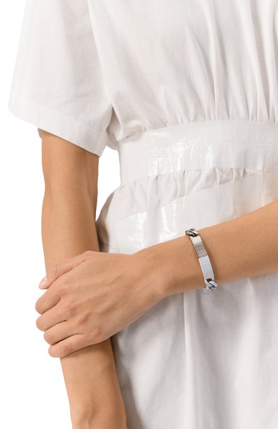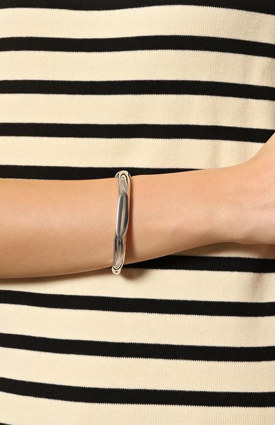 Узкий незамкнутый браслет выполнили из полированного серебра 925-й пробы. На внешней стороне аксессуар декорировали выгравированным числовым кодом.
