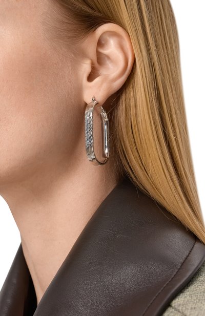 Для изготовления скульптурных серег-обручей использовали латунь с антиоксидантной обработкой. Аксессуар украсили узором, имитирующим плетение snake.