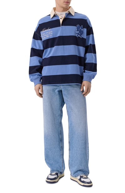 Поло прямого кроя сшито из хлопкового джерси Double Mercerised в полоску. Эластичная модель с контрастным воротником и короткой пуговичной планкой украшена вышитым геральдическим символом марки спереди.